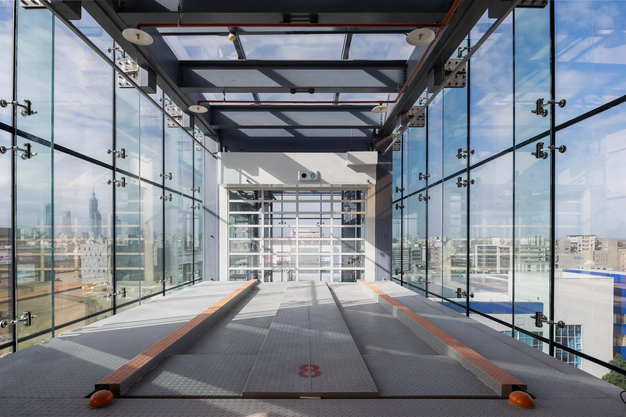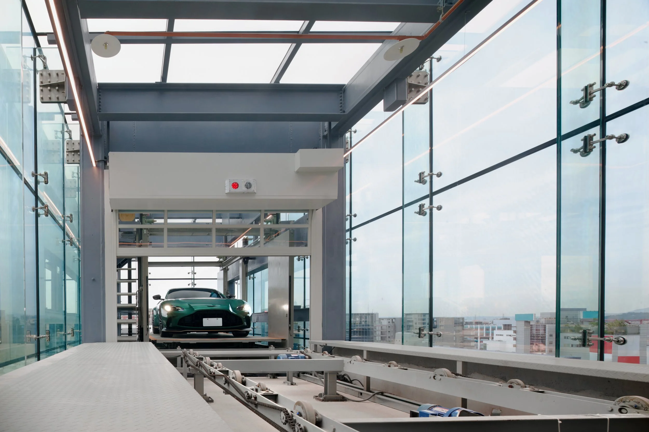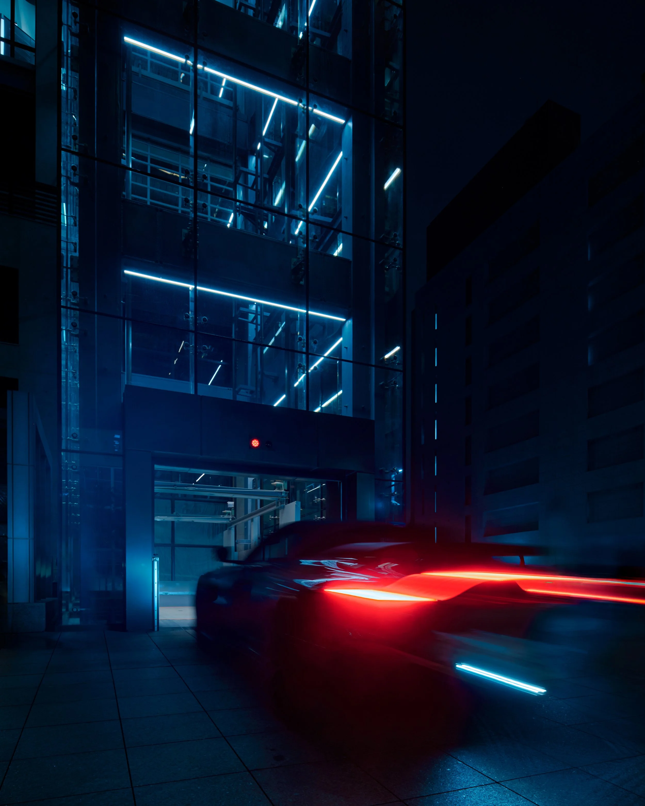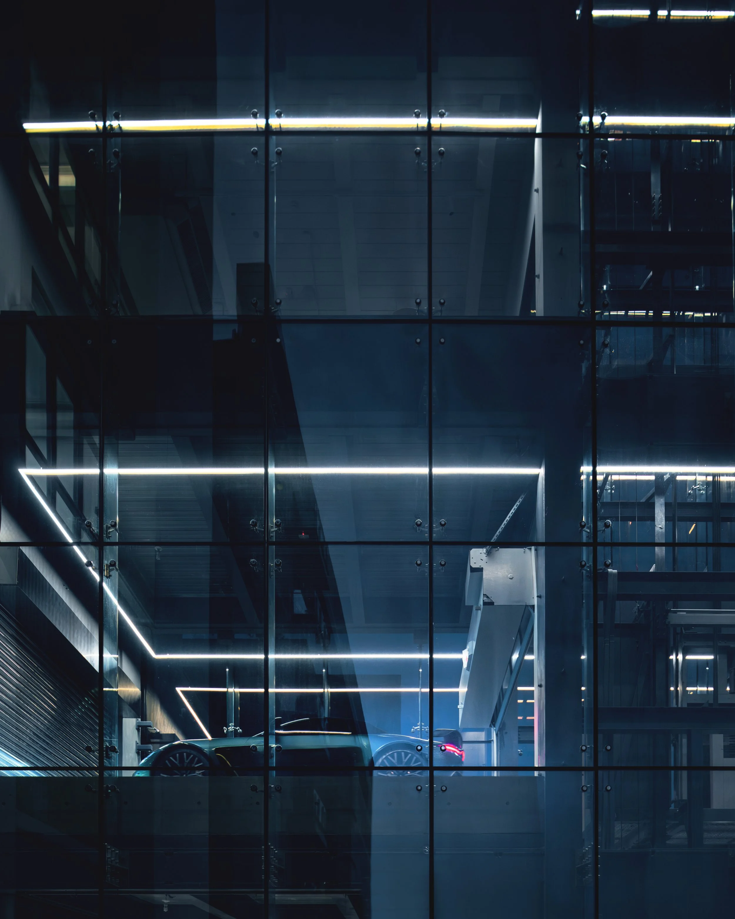 The building was designed to be understated in order to offset the HubAuto supercars that will be featured and transport through the car elevator in front. The shifting windows were inspired by the dynamic movement of auto racing.