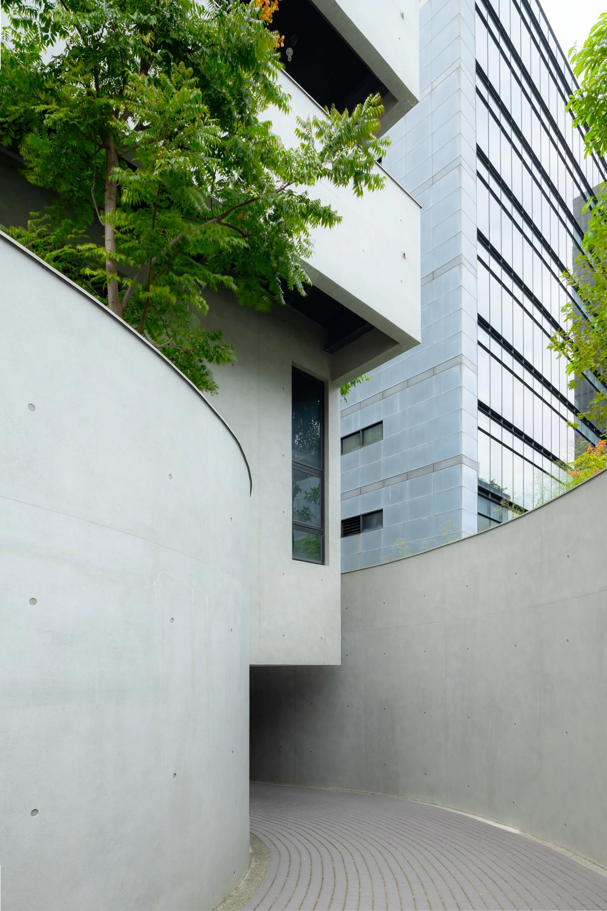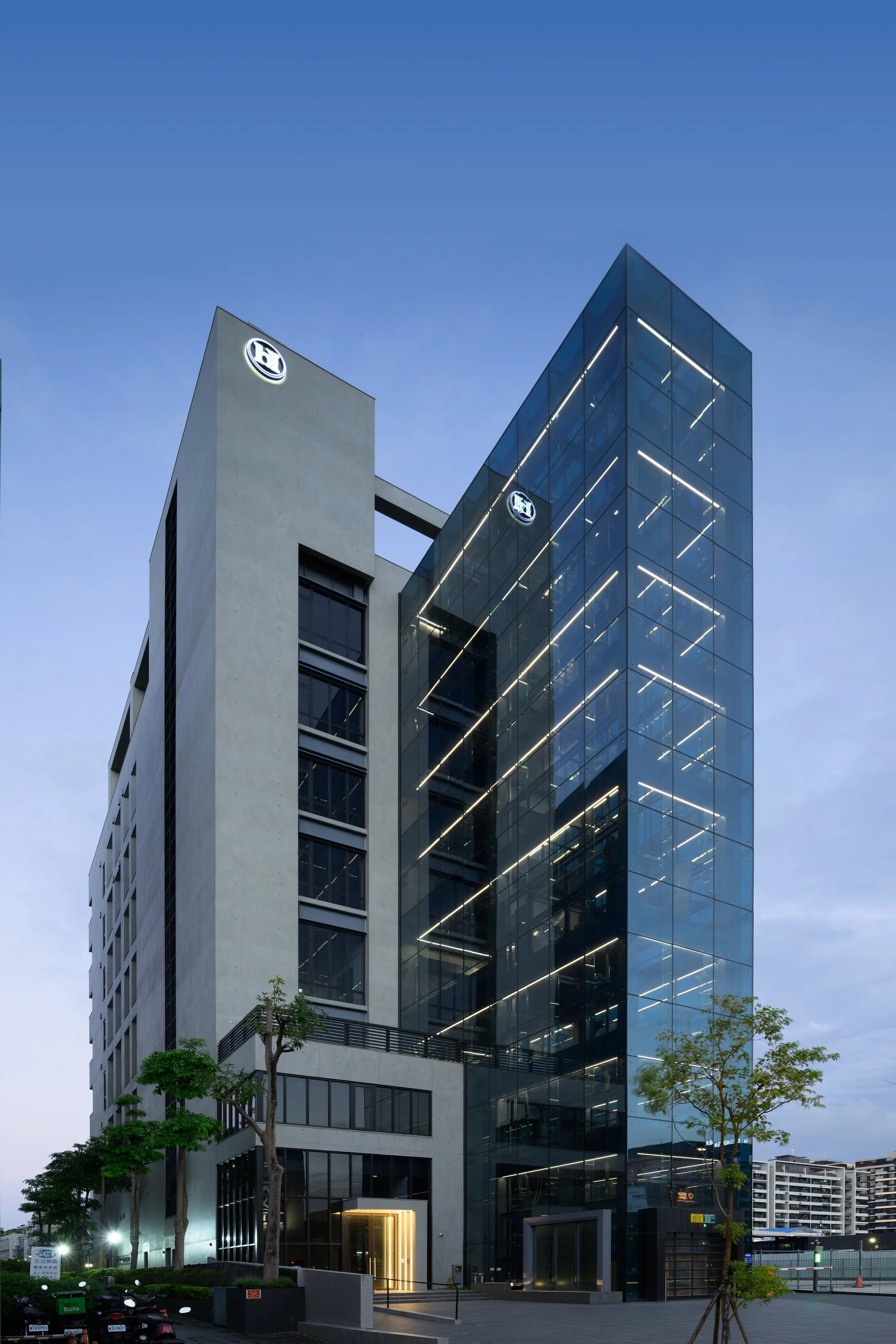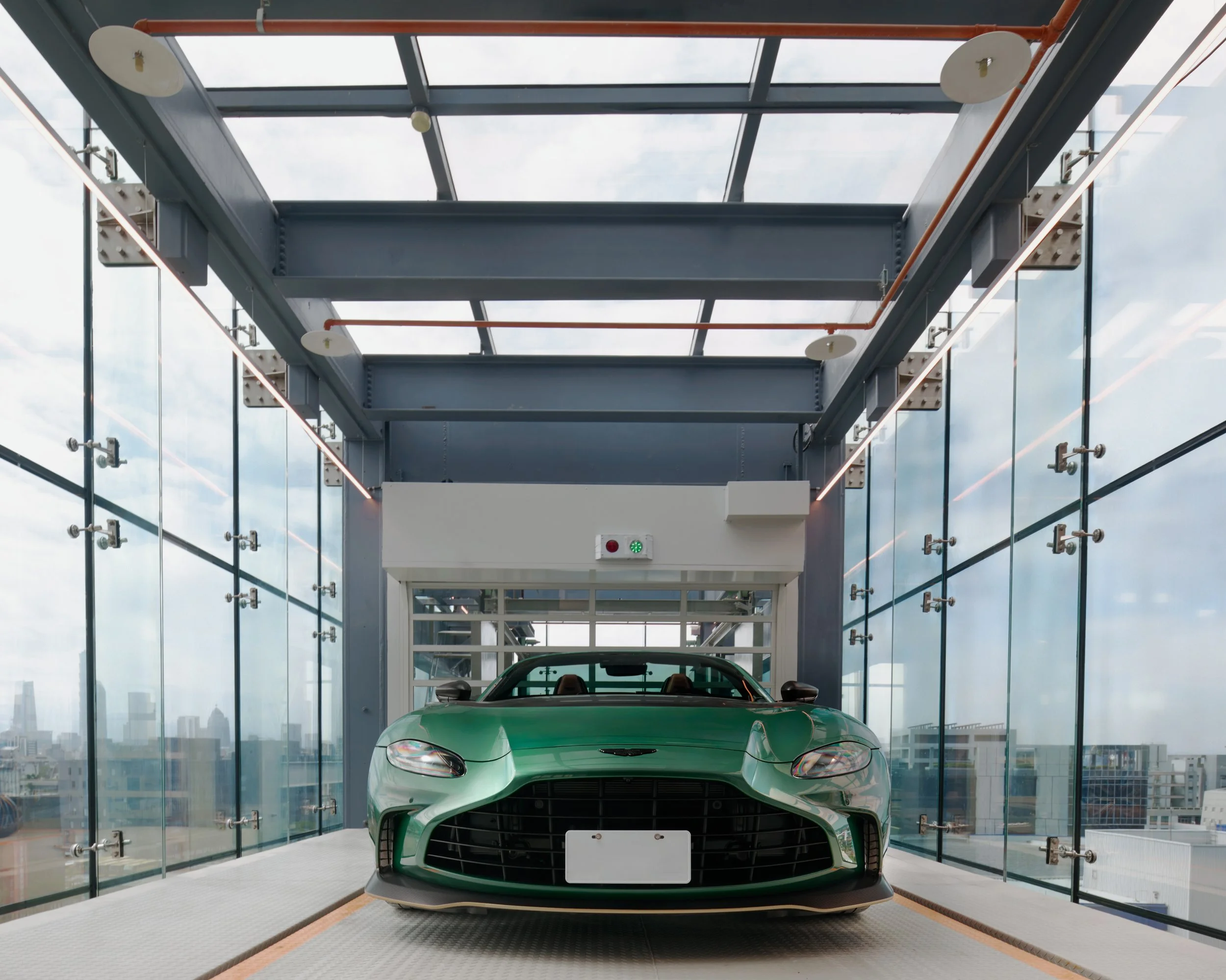 The building was designed to be understated in order to offset the HubAuto supercars that will be featured and transport through the car elevator in front. The shifting windows were inspired by the dynamic movement of auto racing.